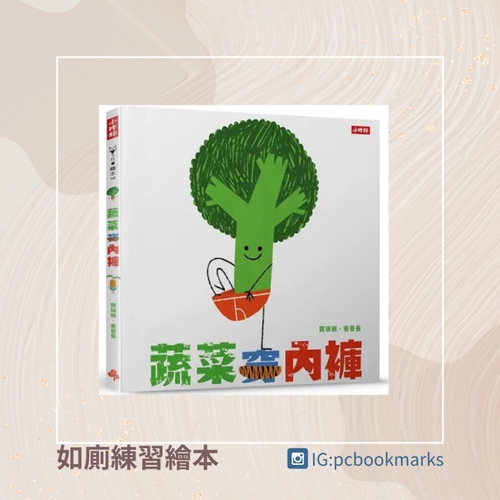 這本繪本很好玩,它的內容主要是畫各式各樣的蔬菜大孩子,穿著各式各樣的內褲,趣味十足。內褲這麼棒,但蔬菜寶寶們卻不能穿,因為寶寶們穿尿布,內褲是大孩子才能穿的喔!